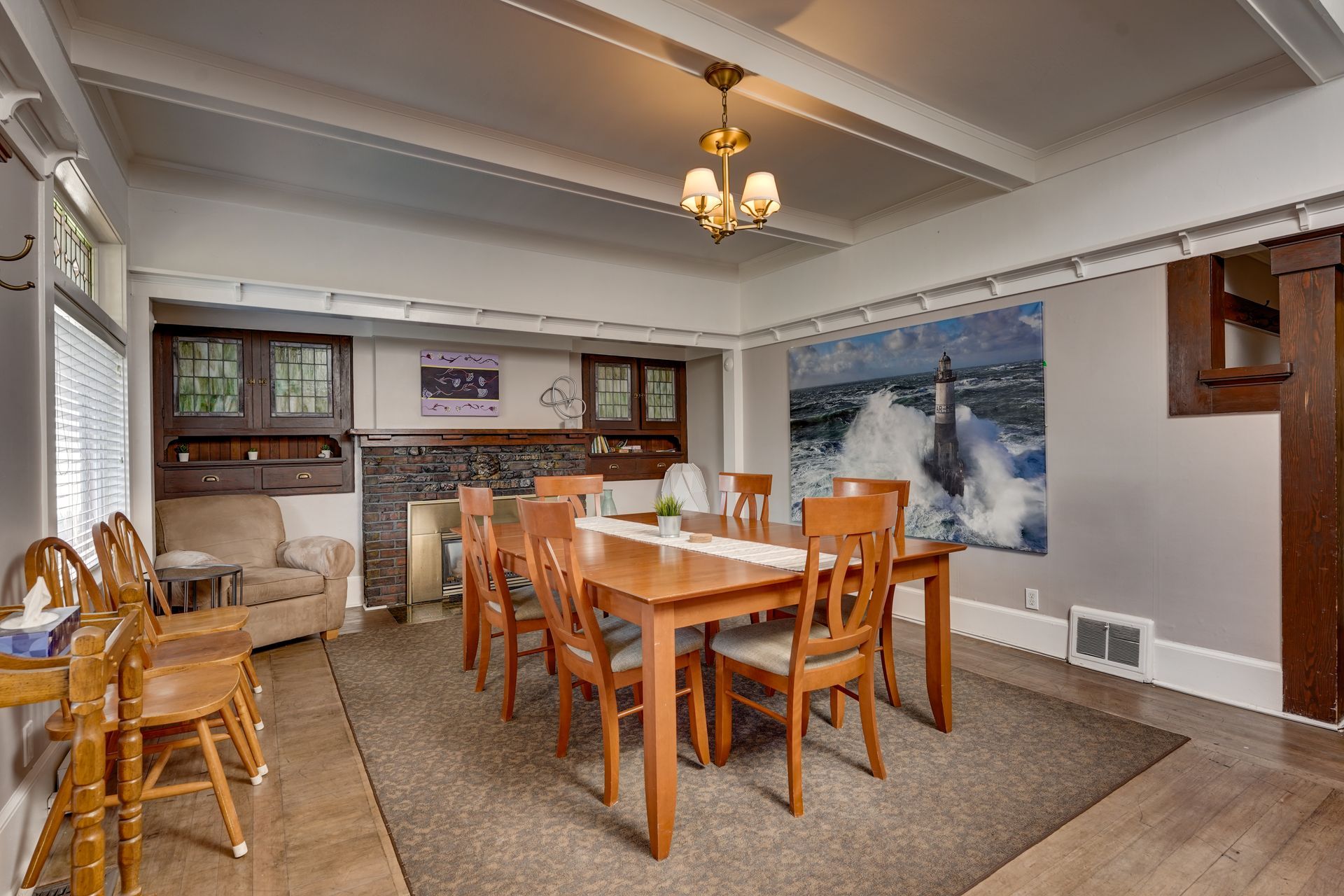 This historic home is a cross-gabled, 1½-storey, Arts & Crafts Craftsman Bungalow with wide bracketed eaves. On the Queens Av façade, there are two shallow, shed-roofed, cantilevered box bays on large brackets, one now enclosed below, and a gabled entry porch on the far right.